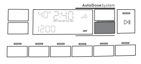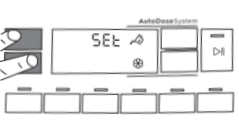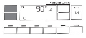 5. För att ställa in basdosering, tryck på motsvarande facks knappar tills standarddosering för tvättprodukter och två pilar längst ner på displayen visas. Tryck på Temp.-knappen upprepade gånger för att öka doseringen och på Spin-knappen för att minska. Minsta steg är 1 ml
