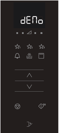 - TRYCK på och håll ned "AUTO avfrostning" -knappen i 3 sekunderTvå korta pip efter 3 sekunder hörsDisplayen går in i vänteläge och sedan:- Ordet "dEMo" visas på displayen i två sekunder- Ordet "oFF" visas sedan på displayen i två sekunder